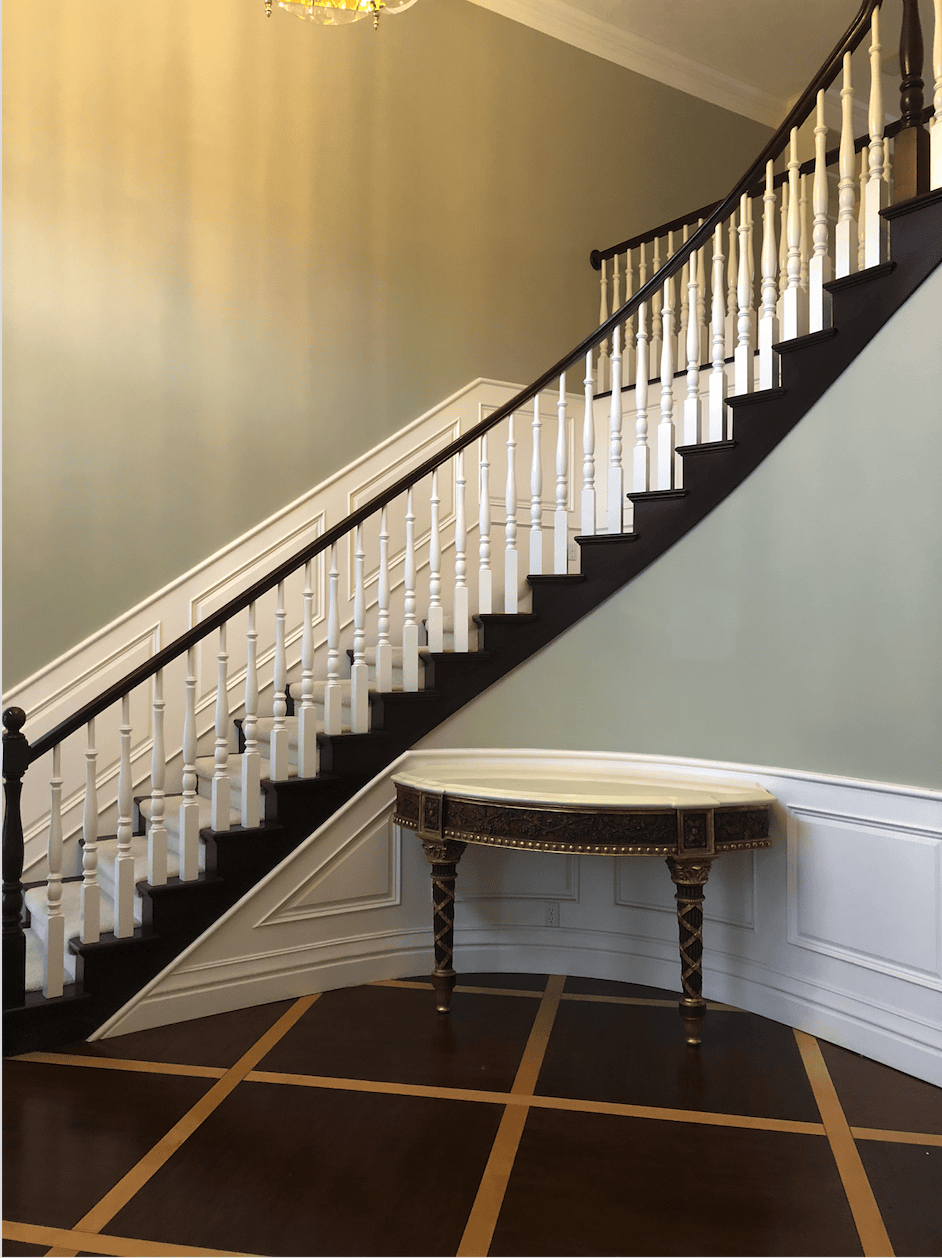 We streamlined it by redoing the stairway with a warm wood and black metal combination, getting rid of the gaudy details, and elongating everything.