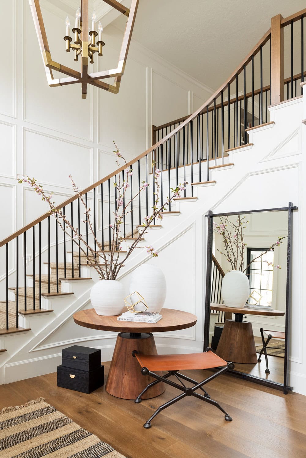 We grounded the curved staircase with a big round table. We don’t typically use something like this unless we can fill it with surrounding a stool and big accessories to draw your eye up to the amazing light fixture. The large branches in the vase do just that!